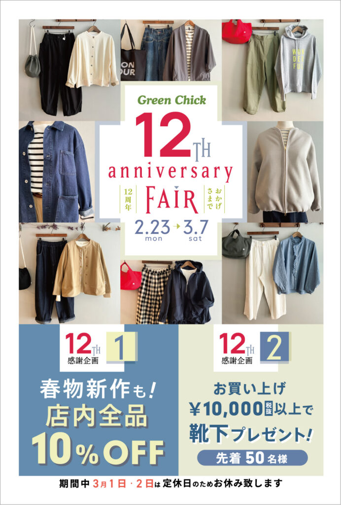 本日2/23〜3/7 12周年感謝祭‼Green Chickは3月4日におかげ様で12周年を迎えます*あたたかい皆様とのたくさんの素敵な出会い、ご縁に感謝致しまして、『12周年感謝祭‼』を本日2/23〜3/7土曜日まで開催致しま〜す! ※感謝祭 […]